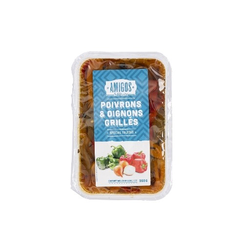 Mélange d'oignons et poivrons coupés en lanières, grillés