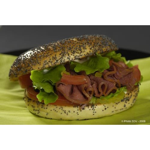 Bagel au pavot avec tranches de pastrami, salade, tomates, oignons,...