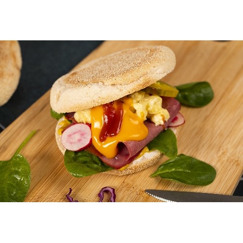 Muffin avec oeufs, tranches de bacon, aiguillettes de poulet...