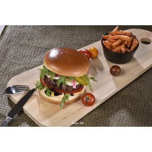 Bun garni d'un généreux steak de bison français, salade, sauce...