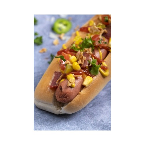 Un pain brioché garni d'une saucisse à hot dog, oignons emincés,...
