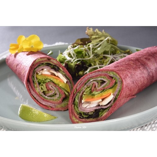 Tortillas de blé à la betterave, pastrami de boeuf, fromage frais,...