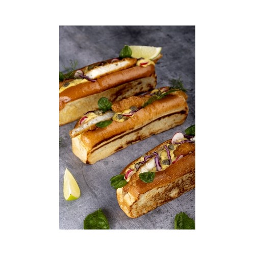 Burger gourmet multigrains avec filet de cabillaud entier pané, tomate,...