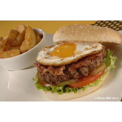 Pain ambiant, tomate, sauce incredible, steak de boeuf, sauce cheddar,...