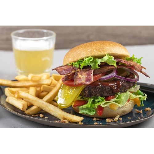 Pain brioché garni d'un steak haché 150g, bacon croustillant, poivrons...