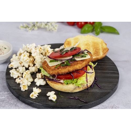Bun gourmet avec aiguillettes de poulet, tomates, concombres, salade et...