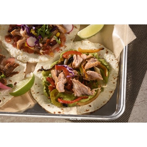 Tortillas de blé garnies de viandes de porc, poulet et boeuf marinées...