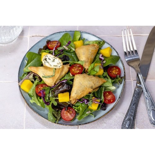 Bricks fondantes de fromage de chèvre parfumées au basilic sur un lit de...