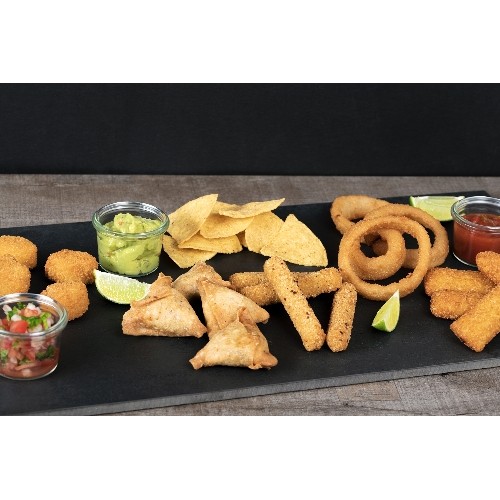 Onion rings, empanadas, teezers, mini saucisse cajun, tortilla chips