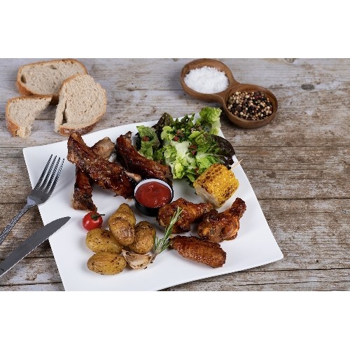 Assortiment d'ailerons de poulet marinés à la sauce bbq, ribs de porc, épis de maïs et pomme de terre cajun.