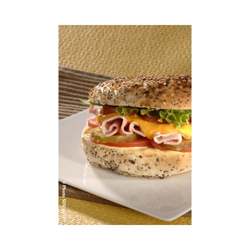 Bagel juste chaud garni de jambon, cheddar et salade.