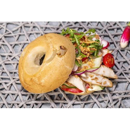 Délicieux bagel aux oignons, agrémenté de filet de poulet à la texane, roquette, cream cheese, oignons rouges, tomates, concombre,radis et moutarde US.