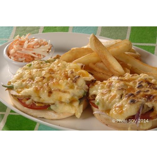 Bagel gratiné garni d'émincés de poulet à la texane, poivrons et oignons grillés.