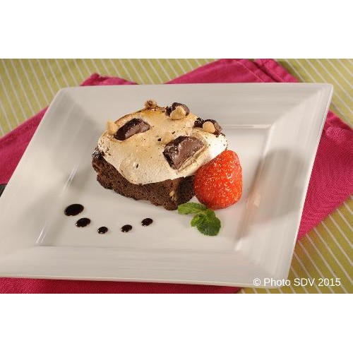 Un brownie classique surmonté de marshmallow fluff et parsemé de copeaux de chocolat noir.