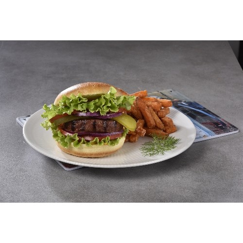 Pain brioché avec un steak végétal, tomate, salade, sauce premium burger, oignons frais et frites de patate douce.