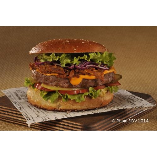 Un pain gourmand garni de salade, sauce cheddar, effiloché de porc, steak de boeuf Angus tradition bouchère et moutarde US.