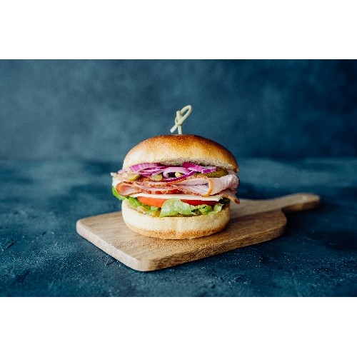 Dans un pain brioché, filet de dinde fumé, fromage, tomate, onion relish, tomate et salade.