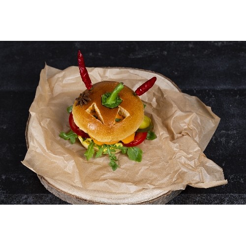 Bun brioché avec sauce cheddar, steak de boeuf, salade, tomates, pickles et décoré de piments oiseau.