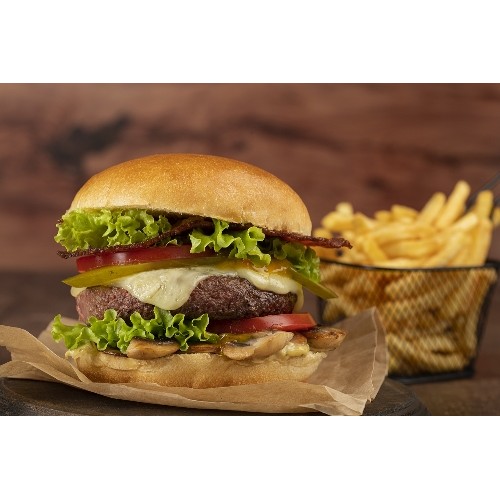 Un sandwich pour les affamés : Bun avec steak, sauce premium, pickles, bacon croustillant, fromage fondu, tomate et salade.