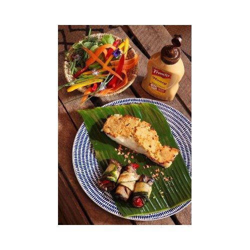 Cabillaud en croûte de moutarde au miel, accompagné de petits légumes grillés au basilic.