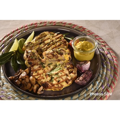 Côtes de porc marinées à la moutarde French's accompagnées d'oignon grillés et d'une poelée de champignon de Paris. Recette pour 4 personnes.