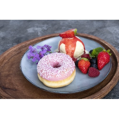 Donut rose servie avec glace vanille, coulis de fraise et fruits rouges