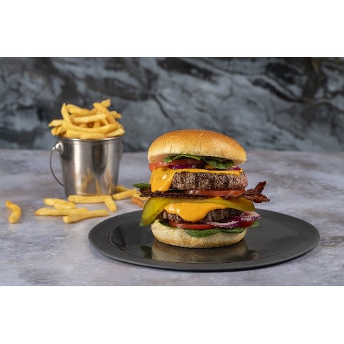Pain ambiant, double steaks bœuf classique pas d’Angus, oignons, sauce cheddar, pousses épinard, tomate