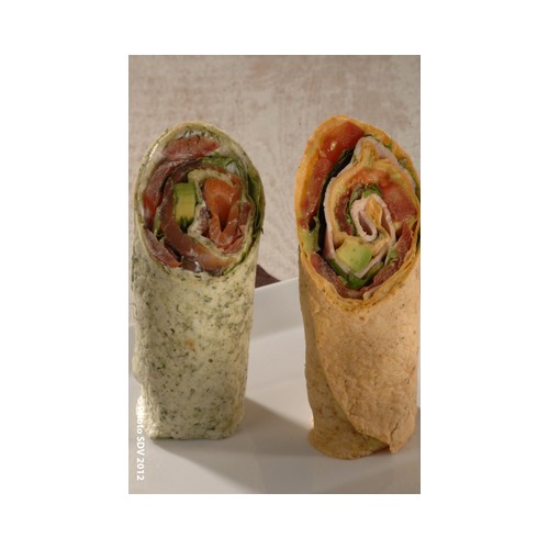 Duo de tortilla épinard et tortilla tomate, garnies de saumon et de pastrami.