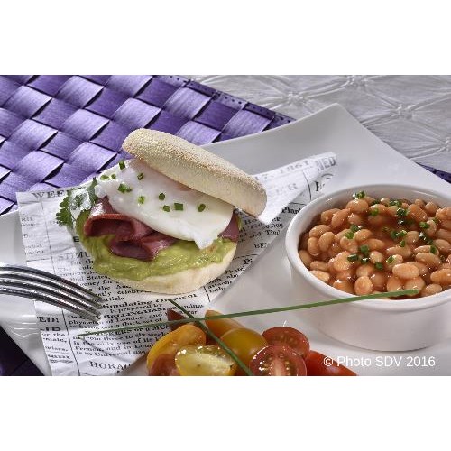 Muffin garni de pulpe d'avocat, pastrami, oeuf poché et servi avec des baked beans, tomates.