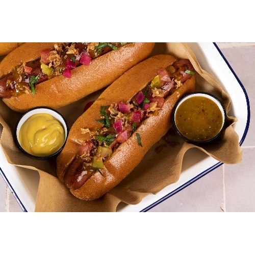 Pain moelleux garni d'une saucisse de boeuf aux épices, nappé de sauce hot dog relish.