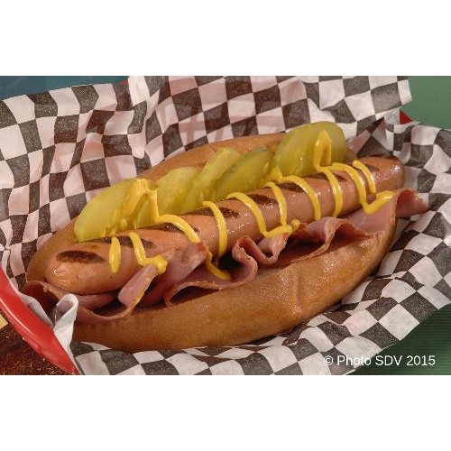un pain hot dog garni de pastrami, saucisse de boeuf, pickles et moutarde americaine.