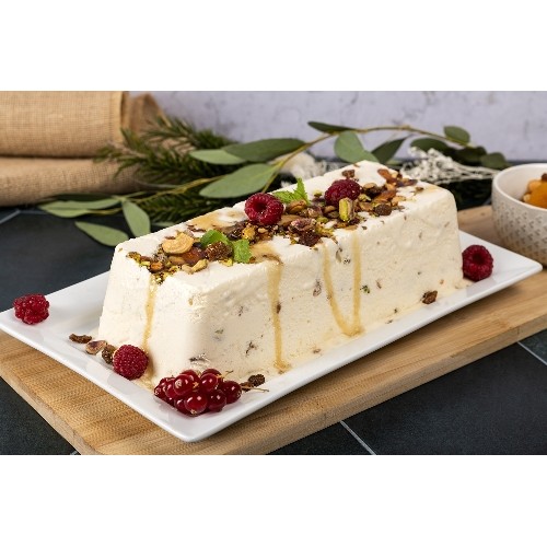 Un nougat glacé riche en fruits secs et en fruits sechés, subtilement parfumé au sirop d'érable.