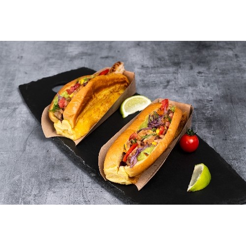 Pain rock and roll, guacamole, filet de poulet, mélange oignons poivrons, pico et choix rouge