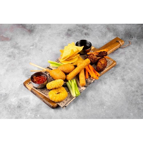 Donuts cheddar, corn dogs, cheddar sticks, wings, tortilla chips servis avec sauce rouge et sauce BBQ.