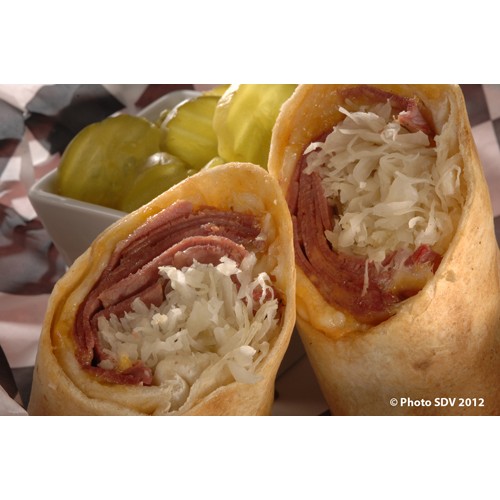 Le fameux sandwich new-yorkais avec pastrami et chou roulés dans une galette de blé.