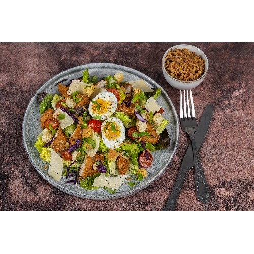 Salade caesar, poulet croustillant, oeuf mollet, tomate, croutons et crispy onions croustillants.