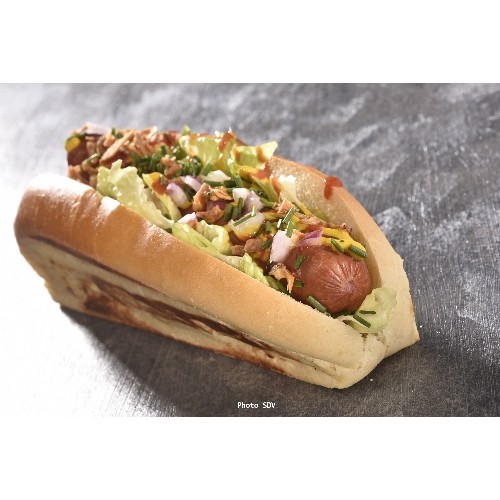 Pain moelleux et fondant traditionnel américain garni d'une saucisse pur boeuf, moutarde, ketchup, crispy, salade.