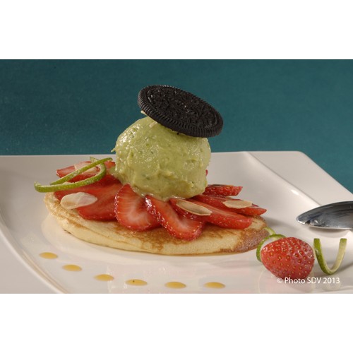 Un dessert original composé d'un pancake et de tranches de fraises fraîches surmontées d'une boule de glace avocat citron.