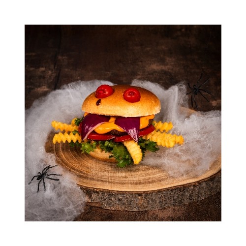 Pain brioché ambiant, steak de boeuf, sauce cheddarn tomate, salade, oignons