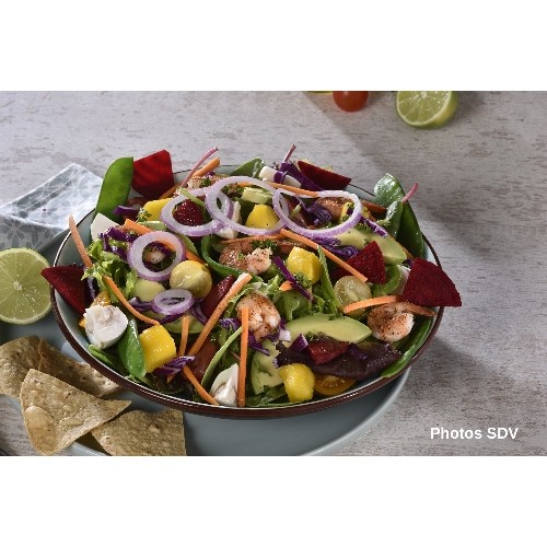 Salade croquante avec lamelles d'avocat, crevettes cajuns, mangue, betterave, tomates, carottes, oignons et assaisonnée d'une sauce poivre crémeuse.