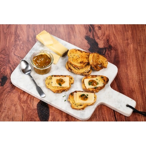 Plateau apéritif avec tranches de pain aux céréales, tranches de comté et sauce hot dog relish