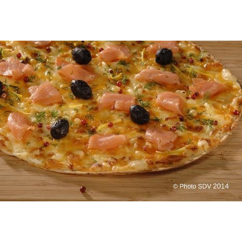 Sur une tortilla multigrains, crème fraiche, mélange de fromage rapè, tranches de saumon, olives, aneth. Relevé d'une pointe de RedHot Chilli'n Lime.