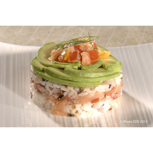 Burger ou le riz remplace le pain, avec tartare de saumon et lamelles d'avocat pour le coté fraîcheur.