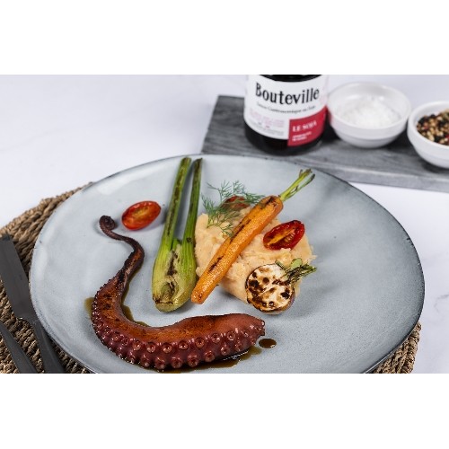 Poulpe laqué à la sauce soja et accompagné de mini légumes croquants, purée de pomme de terre.