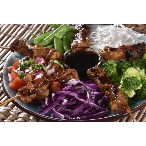 Brochettes yakitori, pois gourmands, vermicelles de riz, brocoli, choux rouge