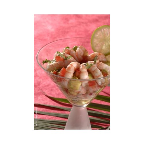 L'association de cubes d'avocat fondant et de queues de crevettes décortiquées, relevée d'un trait de sauce pimentée.