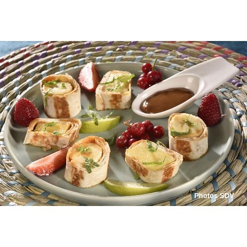 Tortillas de blé garnie de banane, ananas, confiture de lait et accompagnées de fraises, framboise, citron vert, groseilles et une touche de menthe.