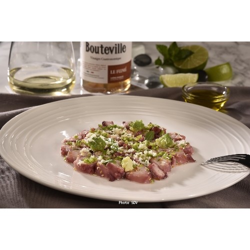 Un met croquant et raffiné au poulpe et aux deux choux relevé d'un vinaigre de Bouteville pointe fumé.