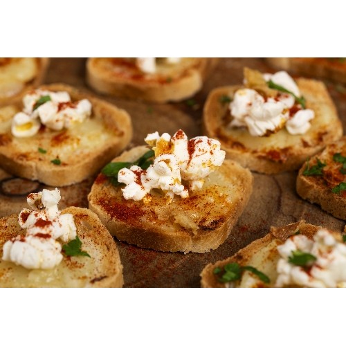 Toast avec fromage saint Marcelin recouvert d'un pop corn et d'un peu de paprika.