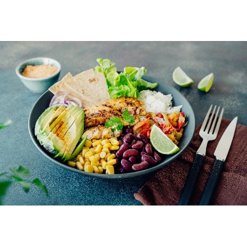 Salade de poulet aux épices fajitas, avocat, maïs, haricots rouges, poivrons grillés et tortilla de blé.